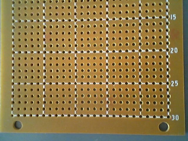 この写真は,基板の裏面です.銅箔が貼られています.穴がたくさんあいて