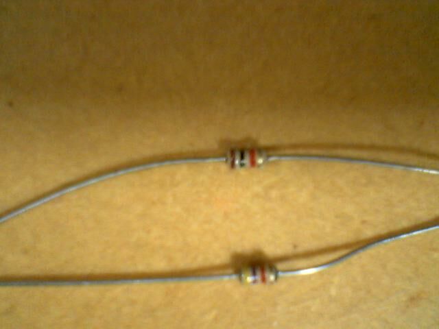 例えば,写真のRは,上が茶黒赤金=1kΩ 下が黄紫赤金=4.7kΩ(共に誤差