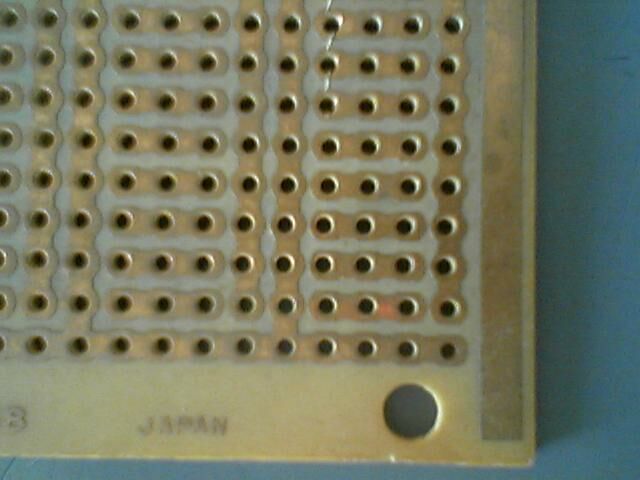 ランドには穴があいていて、ここに部品やビニール電線を基板のオモテ側から挿し、